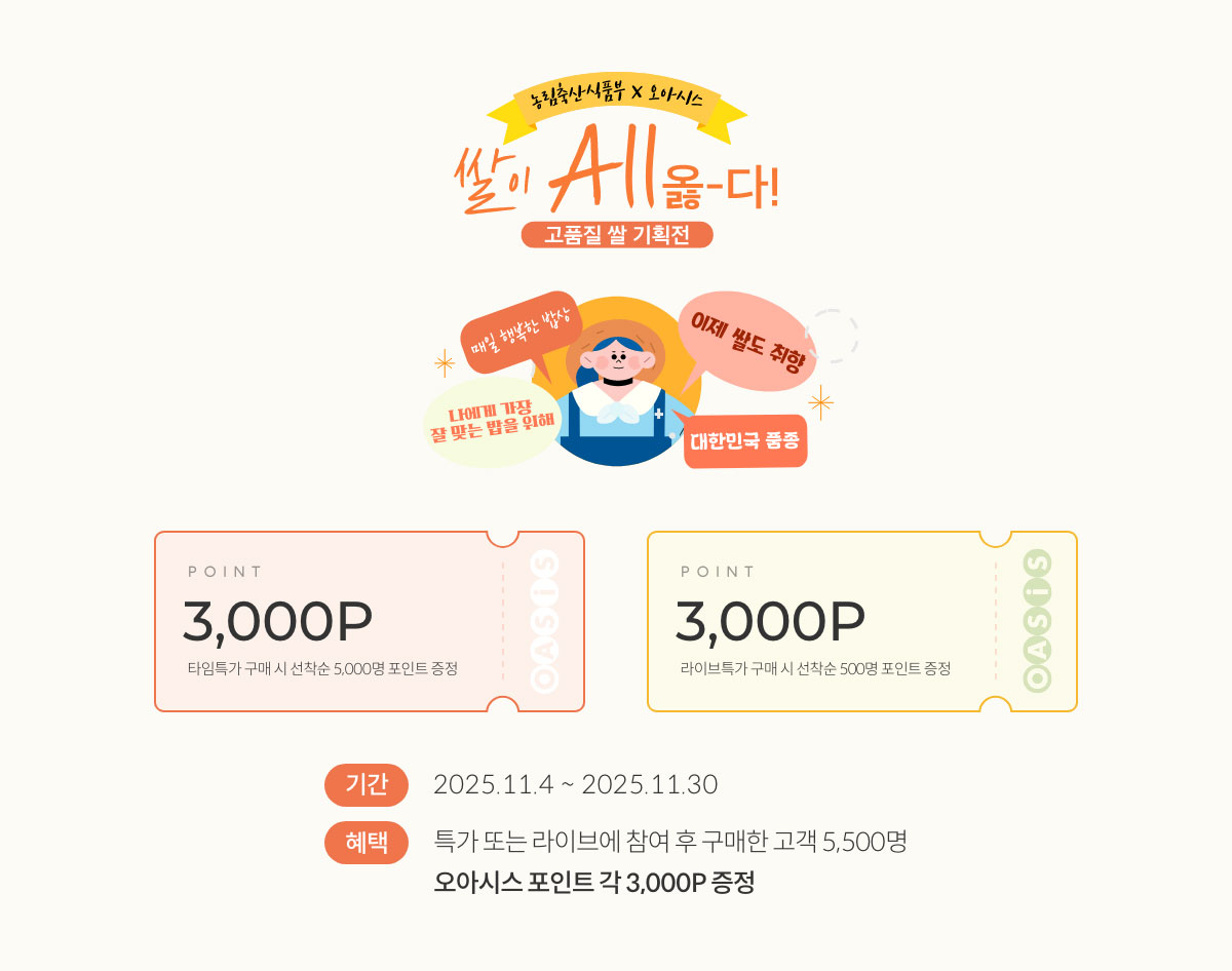 당신의 밥상에 꼭 맞는 '품종'을 찾아볼 수 있도록 오아시스에서 특별 기획전을 준비했습니다. 당신의 하루를 더욱 풍성하게 만드는 고품질 쌀을 만나보세요.
