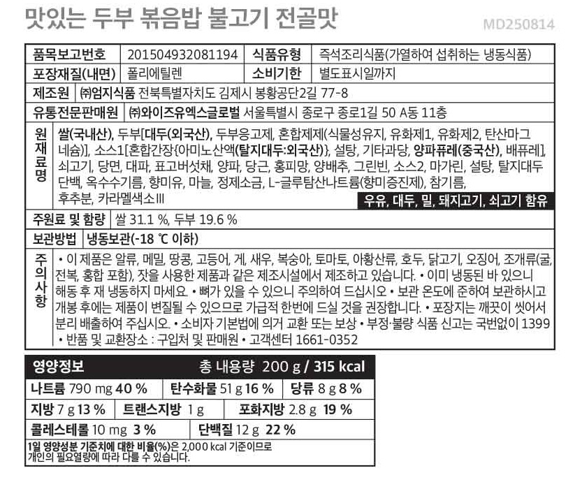 국내산 쌀 100%, 달짝지근한 양념 불고기양념과 식물성 단백질 두부