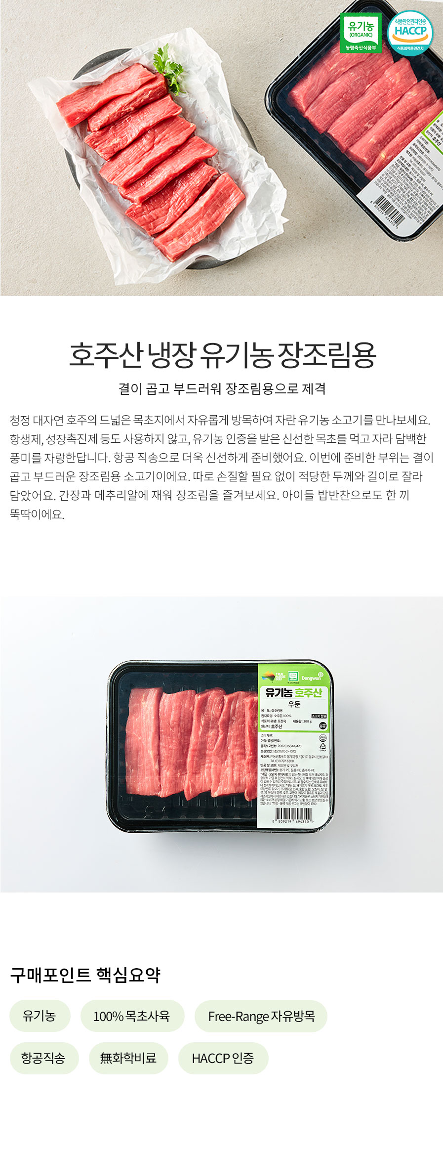 1) 100% 목초 사육: 인공 사료가 아닌 유기농 인증을 받은 신선한 목초만을 먹인 소고기로, 담백한 풍미와 풍부한 영양 함유 2) Free-Range(자유방목): 호주의 드넓은 목초지에서 자유롭게 방목하여 스트레스 없이 자란 소고기 3) 항공직송: 더욱 빠르고 신선하게 비행기로 공수 4) HACCP 인증: HACCP 인증 가공장 생산으로 안심하고 먹을 수 있음