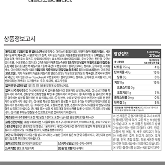 총 내용량 278g(27.8gx10병) 1병(27.8g)당 25kcal 나트륨 75mg(4%), 탄수화물 48g(15%), 당류 8g(8%), 지방 8g(15), 트랜스지방 0g, 포화지방 1g(7%), 콜레스테롤 0mg(0%), 단배질 3g(5%) 1일 영양성분 기준치에 대한 비율(%)은 2,000kcal기준이므로 개인의 필요 열량에 따라 다를 수 있습니다.