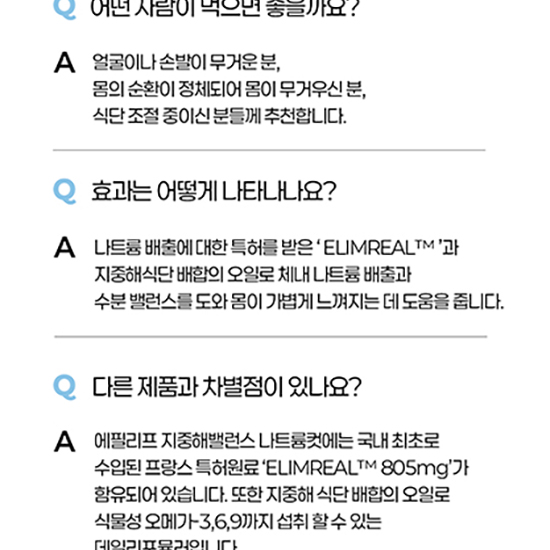 [원재료명][엘림리얼 핏 밸런스(혼합음료)] 정제수, 에리스리톨(감리료), 당근착즙액(튀르키예산), 세븐베리농축액(세븐베리농축액 : 미국산), 시클로덱스트린액, 기타농산가공품[식물혼합분말(엘림리얼)/스페인산], 토마토농축액, 락스로스 리퀴드, 향료(토마토향), 효소처리스테비아(감미료), 무수구연산, 잔탄검, 구연산삼나트륨, 수크랄로스(감미료), 27종과일야채혼합농축분말 [프리미엄 냉압착 페릴라오일(기타식물성유지)] 들기름(냉압착 페릴라유 / 들깨:국산) ※캡슐기제 : 젤라틴(우피), 정제수, 글리세린, 치자황색소, 이산화티타늄(착색료) [에필리프 지중해오일(기타 식용유지가공품)] 올리브유(스페인산), 아르간유(모로코산), 기타 식용유지가공품[에필리프 밸런스오일 / 아몬드오일(아몬드: 미국산), 호박씨유(호박씨:국산)], 비타민E(dl-a-Tocopherol) ※캡슐기제 : 젤라틴(우피), 정제수, 글리세린, 치자황색소, 이산화티타늄(착색료), 치자청색소 우유, 토마토, 쇠고기 함유
