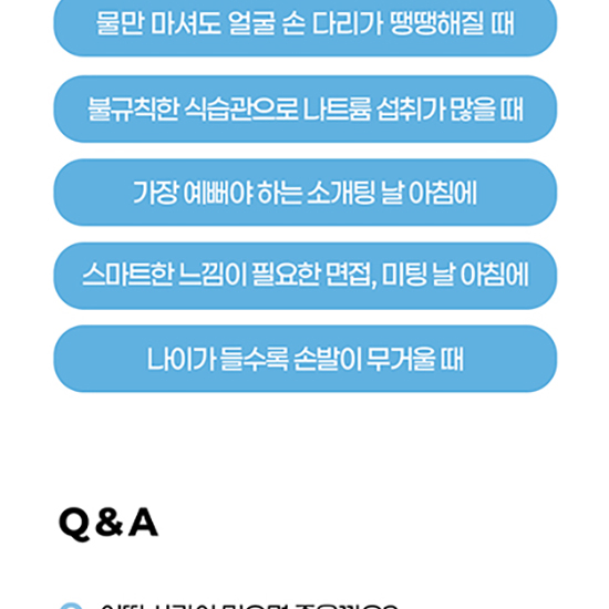 [섭취 시 주의사항] ① 이상사례 발생 시 섭취를 중단하고 전문가와 상담하십시오. ② 소비기한을 확인하시기 바라며, 섭취량 및 섭취방법을 확인 후 섭취하시기 바랍니다. ③ 특이체질 등 알레르기 체질인 경우에는 성분을 확인하신 후 섭취하십시오. ④ 임산부, 수유부 및 영-유아-어린이는 섭취 전 전문가와 상담하시기 바랍니다. ⑤ 원료 특성상 침전물이 발생할 수 있으나 이는 자연적인 현상이므로 안심하시고 섭취하십시오. ⑥ 소비기한 경과, 포장재 변형, 팽창, 손상이 되었거나 내용물이 변질되었을 경우 섭취하지 마십시오. ⑦ 개봉 또는 섭취 시 포장재에 의해 상처를 입을 수 있으니 주의하시기 바랍니다. ⑧ 개봉 후에는 변질될 수 있으므로 바로 섭취하시기 바랍니다. ⑧ 개봉 후에는 변질될 수 있으므로 바로 섭취하시기 바랍니다.
