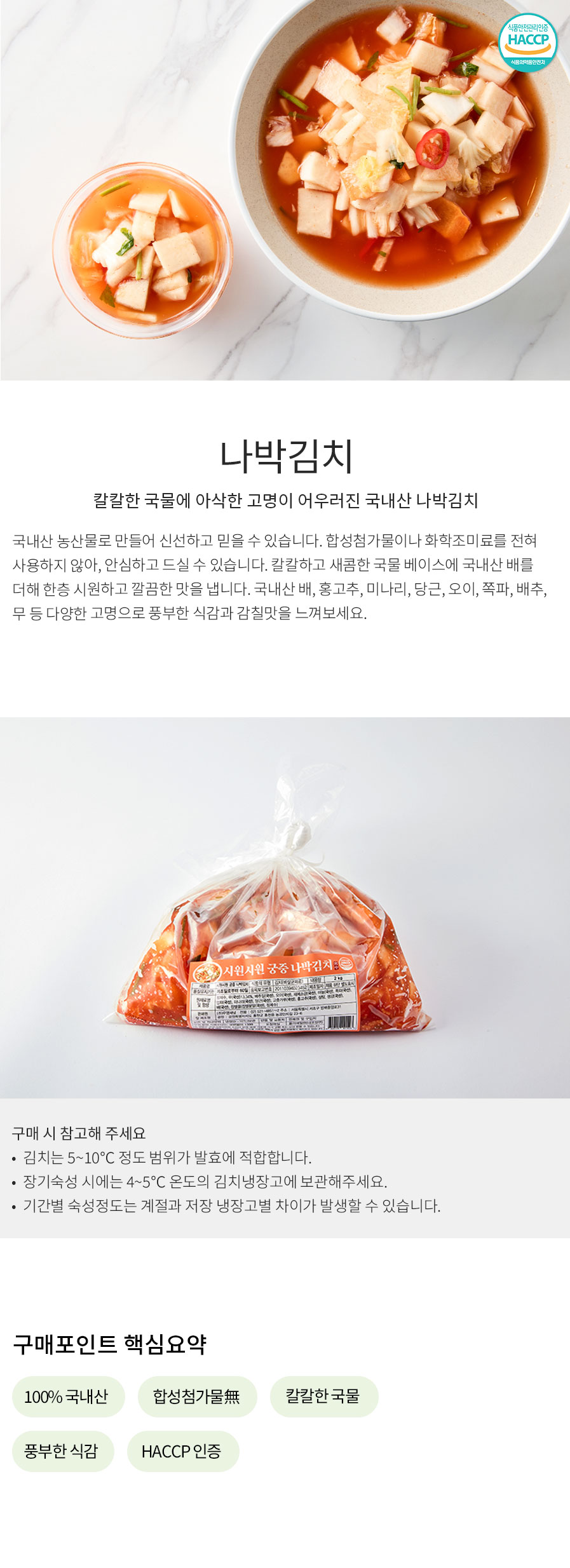 칼칼한 국물에 아삭한 고명이 어우러진 국내산 나박김치