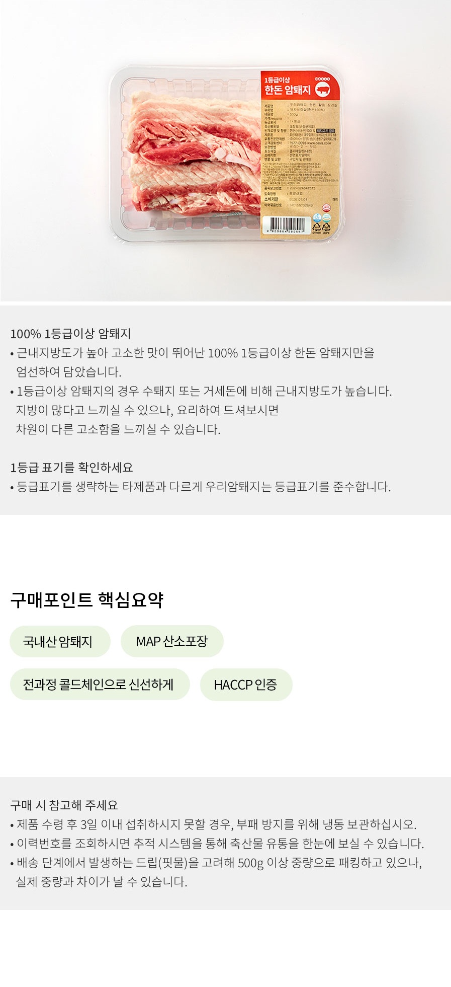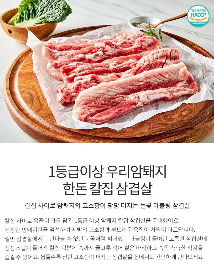 [입점특가] 1등급이상 우리암퇘지 한돈 칼집 삼겹살(구이용/500g)