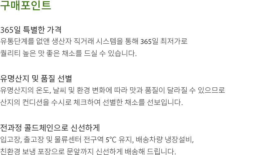 전통있는 친환경 유기농 농가와 직거래, 계약재배를 통해 철저하게 품질을 관리하고 있습니다. 안전하고 신선한 친환경 유기농 농산물을 일반 농산물과 비교해도 될 만큼 저렴하게 제공해 드립니다.