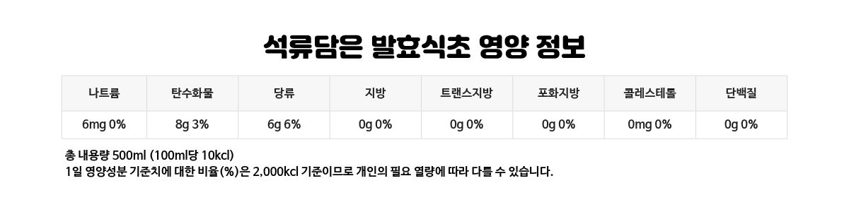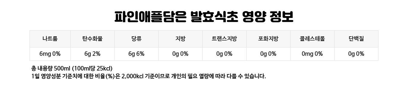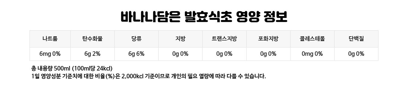 바나나40%(필리핀), 유기현미식초40%[유기현미16%(국산), 엿기름1%(국산), 정제수](국산), 유기농중백당20%(필리핀) 파인애플40%(필리핀), 자연발효현미식초40%[현미16%(국산), 엿기름1%(국내산), 정제수](국산), 유기농중백당20%(필리핀) 석류추출액83%[석류9.09%(미국산),정제수90.91%], 유기현미16%(국산), 엿기름1%(국산)