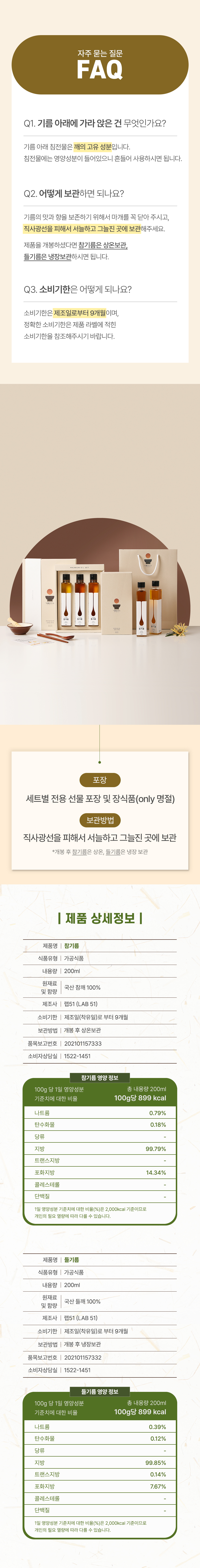 참기름의 맛과 향을 보존하기 위해 마개를 꼭 닫고 직사광선을 피하여 서늘하고 그늘진 곳에 보관하여 주십시오. 침전물이 생길 수 있으나 참깨 고유 성분이니 흔들어 사용하시면 됩니다.