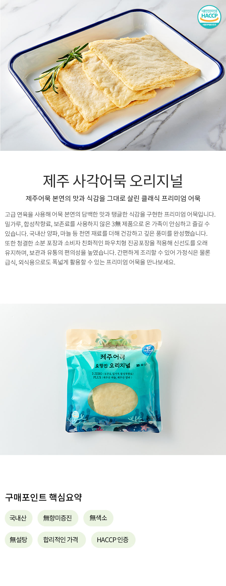 실꼬리돔연육 (태국산), 감자전분 (외국산, 국내산), {당근, 양파, 마늘 (제주산)}, 현미유 천일염, 핵산, 인산염혼합제제(폴리인산나트륨, 피로인산나트륨), 글리신, 효모추출물
